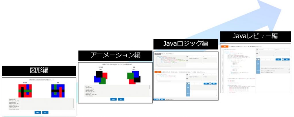 Javaロジック編ー図形編・アニメーション編と同様にサンプルプログラムを修正していくことでJavaの基本的な文法を身に付けます。